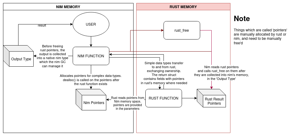 deallocatedprior to return of the procedure, before the result is given to the user. Be itallocatedby Rust, orallocatedby Nim. - Manual allocation of data can only occur in Rust if the function does not return an error. All